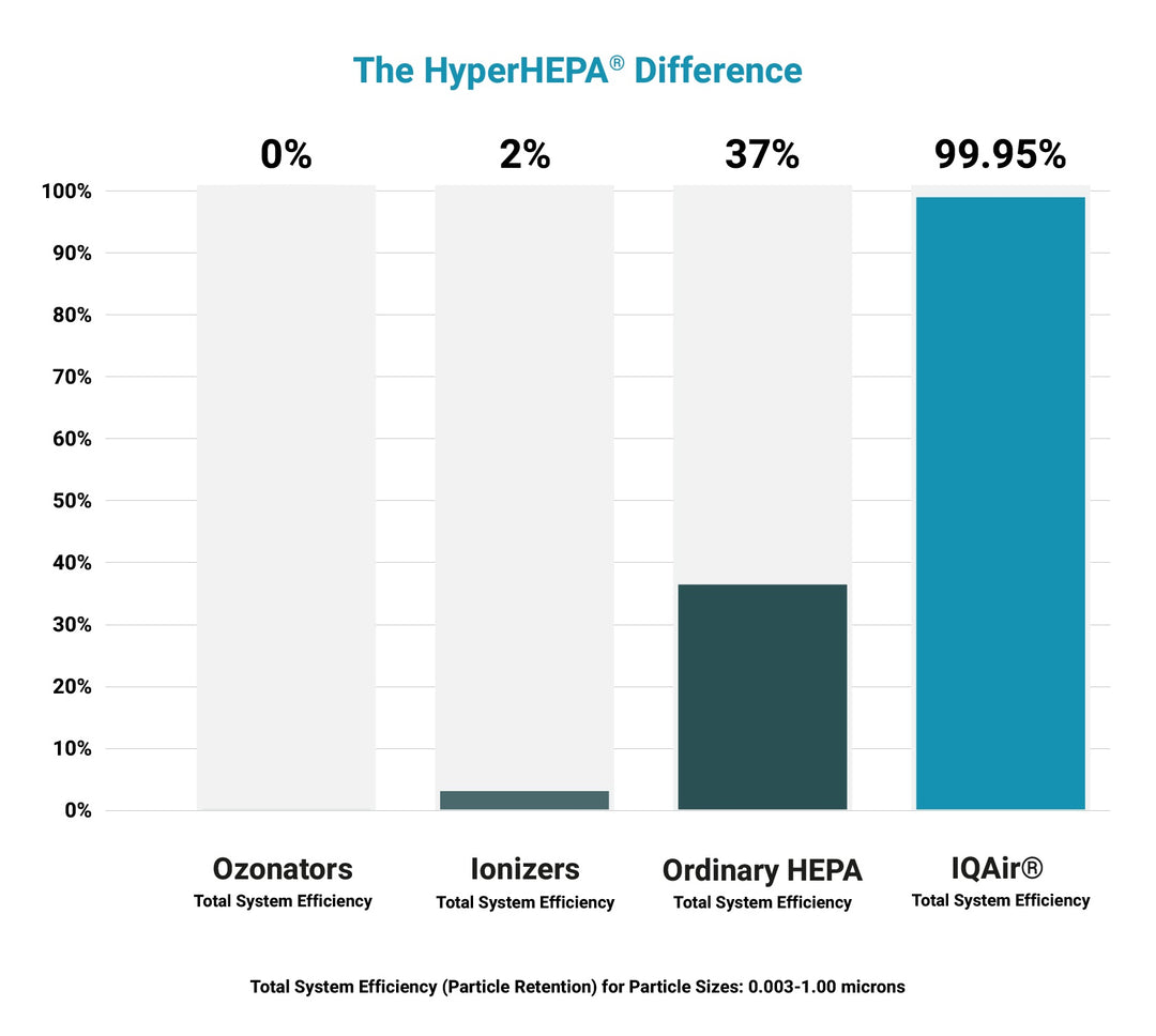 • The IQAir HyperHEPA filter eliminates fine and ultrafine particles, including bacteria, viruses, and combustion particles