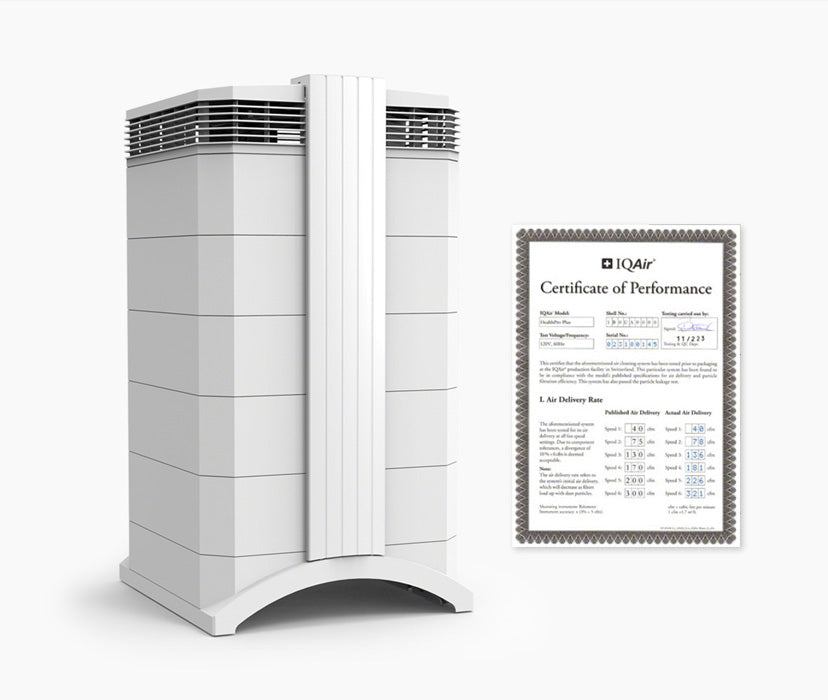 HyperHEPA® Filtration: The IQAir HealthPro Series features HyperHEPA filtration technology for superior airborne particle removal. IQAir’s HyperHEPA filtration is tested and certified by an independent third-party lab to effectively filter harmful ultrafine pollution particles down to 0.003 microns in size. This is 100 times smaller than what is achieved with ordinary air filtration technology and 10 times smaller than a virus. In addition, to ensure that every IQAir HealthPro Series air purifier is actually delivering superior air quality, each and every system is individually tested at the factory with an electronic particle counter and is certified to filter a minimum of 99.97% of all particles 0.3 microns or larger.