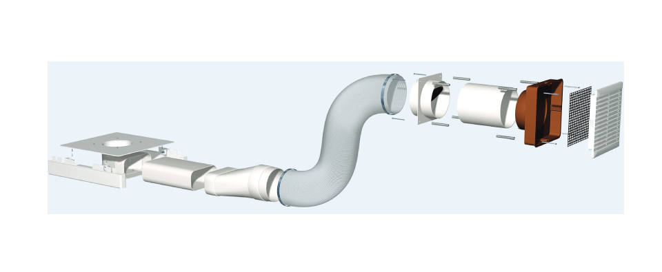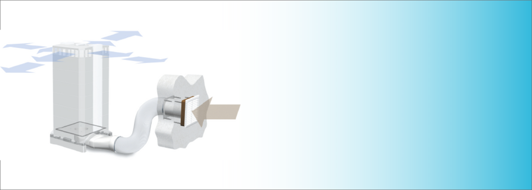 With the InFlow ducting adaptor, every IQAir system can be connected simply and rapidly. Only one wall aperture is required for the installation of the InFlow. The large diameter of the ducting connections helps reduce air resistance, and the flexible ducting tube can be bent in any direction.