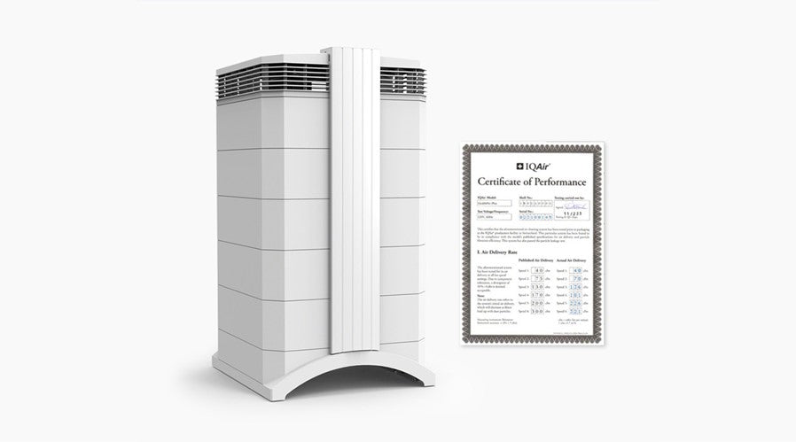 IQAir individually tests each HealthPro Series at the factory to verify that your HyperHEPA filtration is meeting our exacting standards in reality, not just theory. We test total system efficiency – the actual air coming out of the outlet. If the system is not delivering 99.97% cleaner air or better, we don’t ship it. Period. The results of the tests are detailed in a hand-signed Certificate of Performance, which is shipped with every HealthPro system.