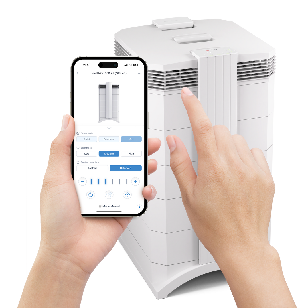 The IQAir HealthPro 250 XE introduces intelligent, sensor-driven operation. A built-in PM2.5 sensor continuously monitors indoor air quality and automatically adjusts performance in real time through Smart Mode.